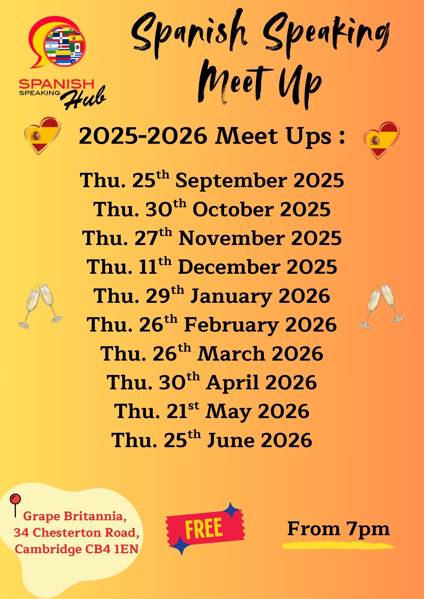 Are you passionate about the Spanish language and hispanic culture or a Spanish-speaking expatriate in the Cambridge area? You are in the right place! Get together with like-minded people in a friendly environment and take part in lively conversation and meet new people!